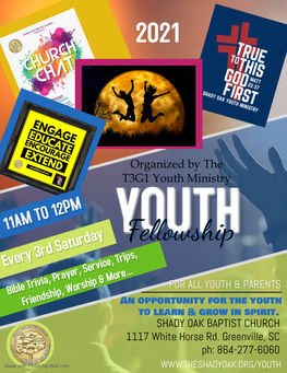 The foundation and overall purpose of the Shady Oak Youth Ministry is to God and his glorification. Our objective is to raise a generation of youth who know the Lord Jesus Christ. The ministry promotes various programs, activities, and studies that compliment, enhance, and agree with this most important objective. God created us to love and to please Him; to be a part of His family; to become like Christ; to serve Him; and to tell others about Him. The Shady Oak Youth Ministry is committed to being a tool for God to move in the lives of our youth, so that they may fulfill God's purpose for the creation of their lives. If you are a youth who hungers to know Christ or an adult who has a passion to allow God to guide you in impacting the lives of young people, please join us in these works! Glory to God for it all! We are...True To This God First! #T3G1